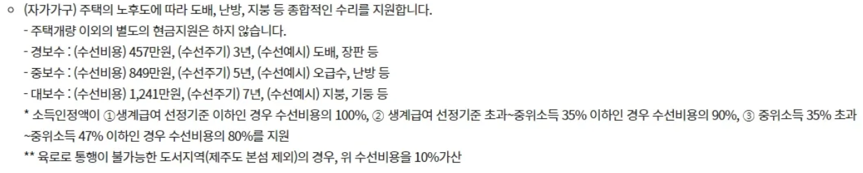 본인 소유 주택을 보유한 사람은 주거급여를 현금으로 지급하지 않고 보수비를 지원합니다. 여러 가지 노후 상태를 점검하여 경보수, 중보수, 대보수로 나뉘며 각각 지원 금액이 상이합니다.